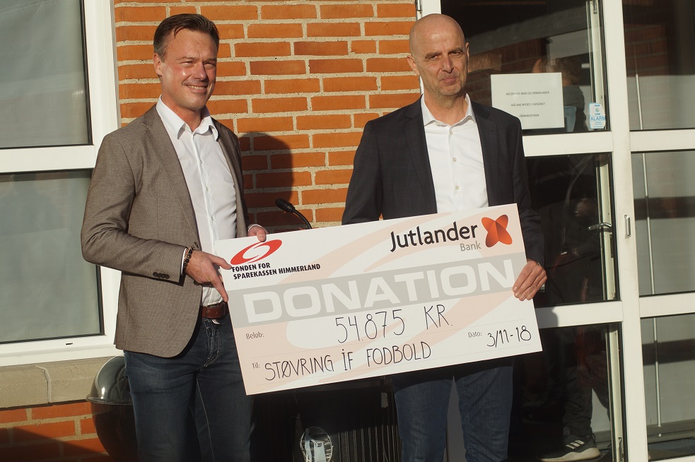 Han overrakte SIF-formand Lars Krunderup det synlige bevis på en økonomisk håndsrækning til et nyt lydanlæg på Støvring Stadion, en check på knap 55.000 kroner, helt nøjagtigt 54.875 kroner.