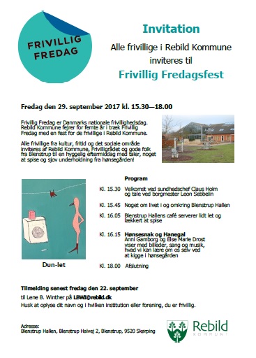 - Alle frivillige inviteres hermed til Frivillig Fredag i Rebild fredag 29. september kl. 15.30-18.00 i Blenstrup Hallen.