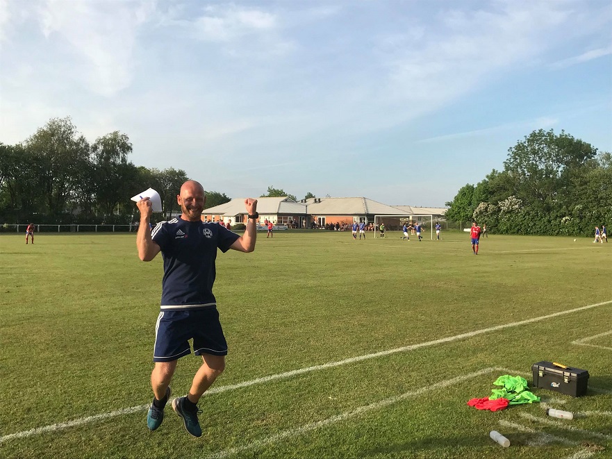 Uffe Agerbo Jensen, Serie 2-træner i SIF-lejren, i jubel da 3-3 blev til 5-3 før pausen. Foto: Rasmus Carøe Eriksen