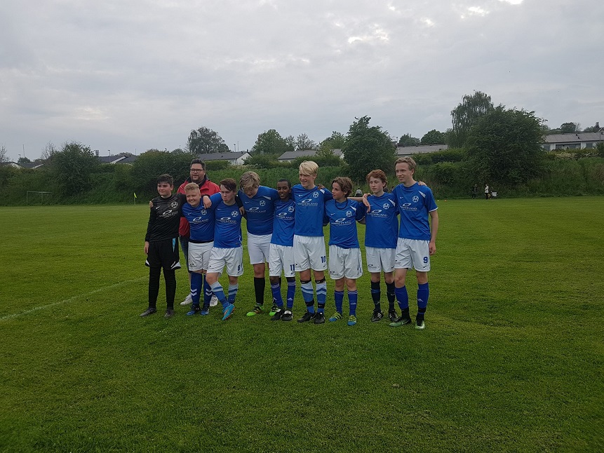 U 15 C-drengene tog den sjette sejr på stribe med 6-4 ude over Aalborg Chang - samlet målscore 30-9. Her med vikaren som udskiftningsleder Steen Rudkjøbing ved deres side efter sejren over Chang. Foto: U 15-drenge
