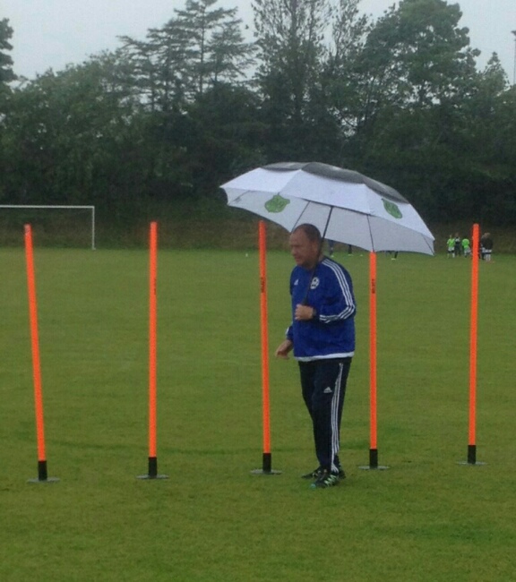 Jan "Krølle" Nielsen - trænerleder på SIF Fodboldskolen 2017 - tog sine egne forholdsregler, da regnen stod ned i stænger torsdag, dag 4 af SIF Fodboldskolen 2017. Foto: SIF Fodbold
