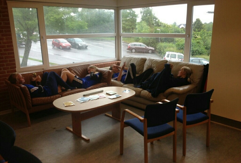 Trænere var brændt ud til middag (som det ses af nedenstående foto), så middagspausen blev også brugt til at få benene op i sofaen i træner/lederrummet i klubhuset - men samlet alligevel en rigtig god og sjov dag.