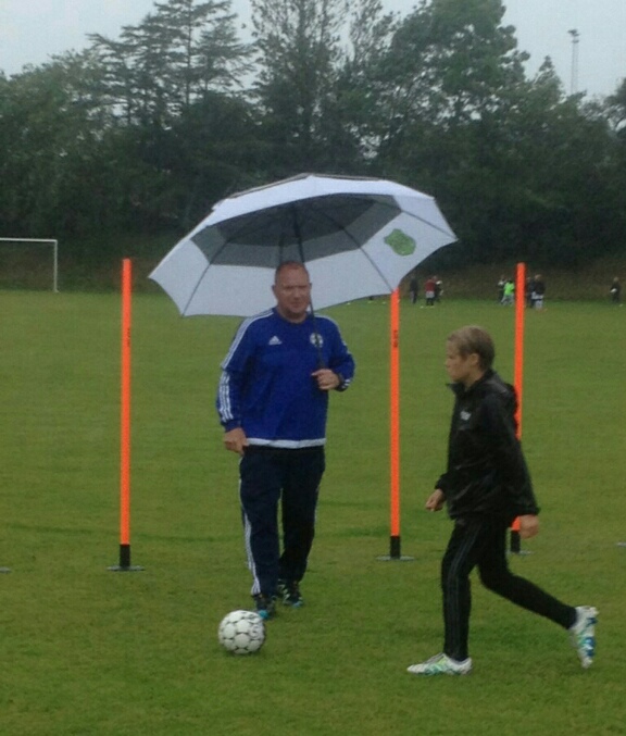 Formiddagen gik med stationstræning, og over middag afviklede vi en Sneakers Cup. Deltagere og trænere blev godt våde i løbet af formiddagen. Pigerne og drengene (og de unge trænere) kunne jo ikke gå rundt som trænerlederen (Jan "Krølle" Nielsen, red.), der havde udstyret sig selv med en paraply.