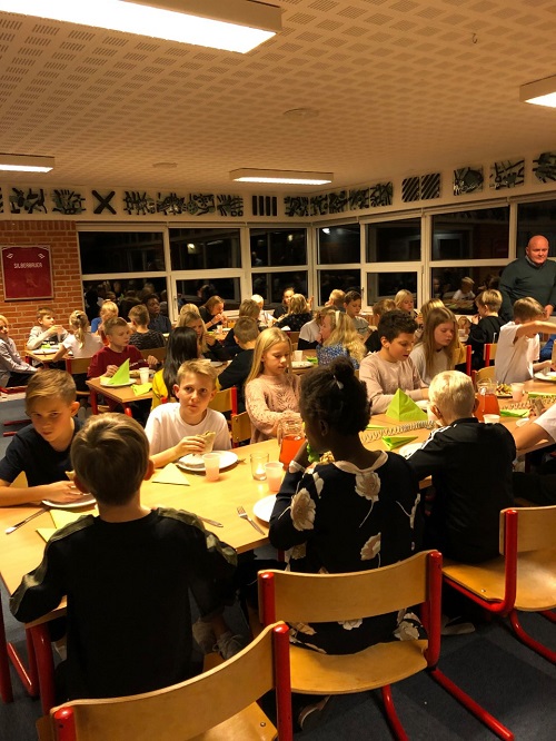 Vandkæmmet hår, flotte fletninger, fine kjoler og nystrøgede skjorter fyldte i lokalerne, hvor børnene normalt er klædt i de blå/hvide farver. Der var inviteret til middag kl. 18, hvor de startede med champagne.