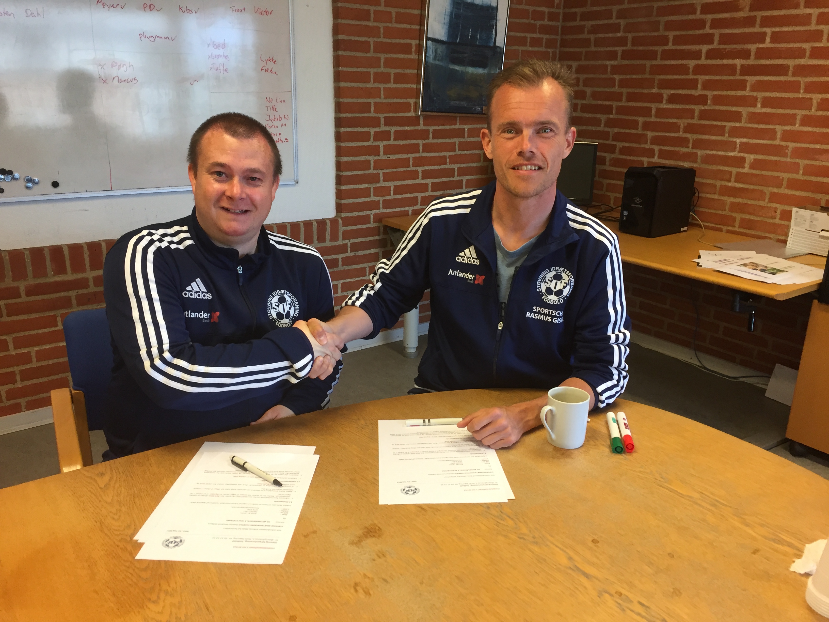 Brian Østergaard Larsen (t.v.) - her sammen med sportschef Rasmus Gissel, da aftalen omkring U 14-andetholdet blev landet - kunne glæde sig over, at U 14 Liga 5-tropperne tog andenpladsen med 4-1-sejren ude over Nibe/Aars forleden. Arkivfoto
