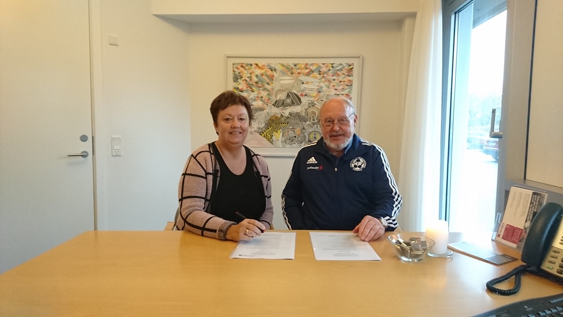 Marianne Westergaard, afdelingsdirektør i Jutlander Bank Støvring, og SIF-formand Kaj Madsen underskrev den nye sponsoraftale forleden.