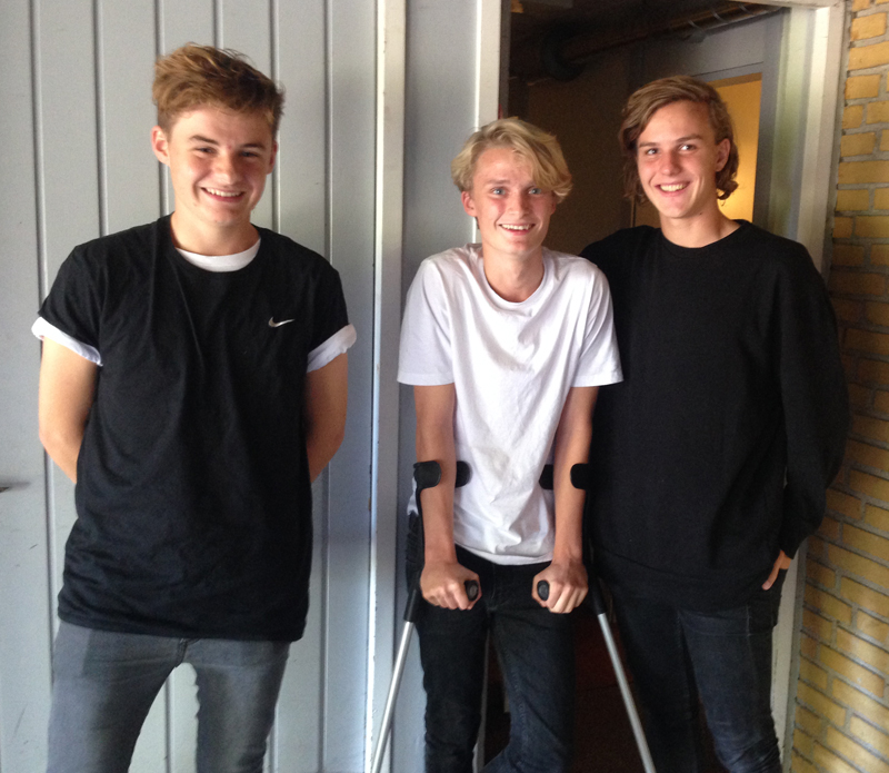 Den skadede U 17-kaptajn Asger Bundgaard Nielsen sammen med Gug-spillerne Mads Tøbøl og Mikkel Løgsted, der dukkede op sammen med deres U 17 Gug-cheftræner Anders Klagenberg med en god-bedring-gave til den uheldige SIF-spiller. Foto: Gug Boldklub.