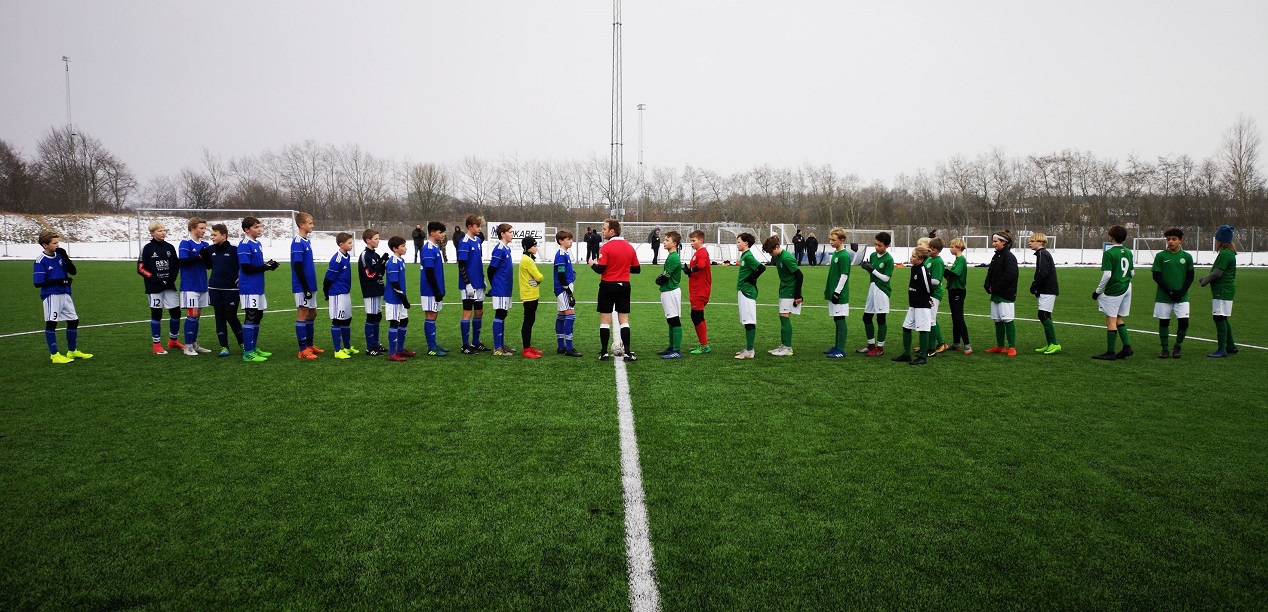 U 14-drenge og modstanderne fra Viborg FF hilste på hinanden før kampstart. Foto: U 14-drenge