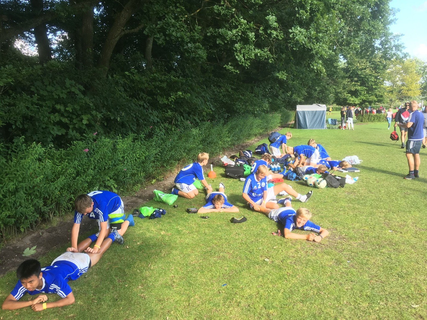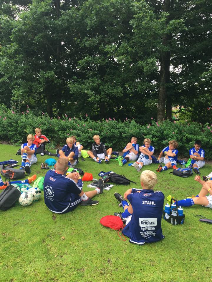 U 15 1-drenge og cheftræner Mikael Sindholt under en udstrækningsøvelse efter lørdagens succesrige sejrstogt under Vildbjerg Cup 2016. U 15 1-drenge skal spille A-finale på bane 1 i Vildbjerg søndag morgen kl. 08.45 mod BK Skjold. Foto: U 15-drenge