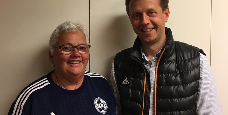 Ruth Andersen, SIF Fodbolds koordinator omkring julestævnet, og Jannik Riis fra Select Technica Football har forlænget aftalen omkring hovedsponsoratet til julestævnet.