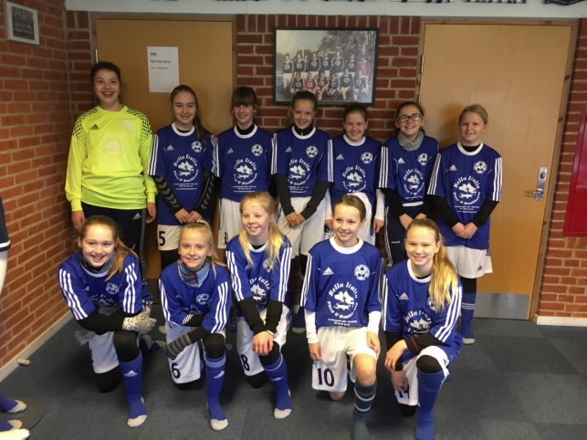 U 12-U 13-piger i deres nye spillerdrager. Bagerst fra venstre: Albina Katjazaj, Sara Bjerregaard, Selma Rugaard, Cecilia Kvist Rasmussen, Marie Petersen, Dea Nimoni, Julie Holm. Forrest fra venstre: Cecilie Randrup, Sinne Linnerup, Cecilie Skov, Marie Andersen, Jessica Jacobi. Foto: U 12-/U 13-piger