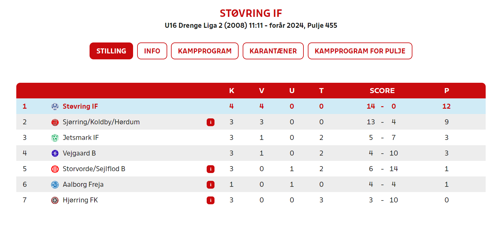Status efter 4 turneringskampe er 4 sejre, og en målscore på 14-0, hvilket må siges at være mere end godkendt. Holdets forventning, og vores klare mål er at vinde samtlige kampe i sæsonen, og det mangler vi “kun” 8 kampe for at gøre nu. Næste kamp for drengene er nu på lørdag d 13-04-2024, på udebane mod Sjørring. Jeg vil personlgit vurderer at det er os og Sjørring der klart er de to bedste hold i puljen, så kampen på lørdag bliver en skæbnekamp for resten af vores sæson.