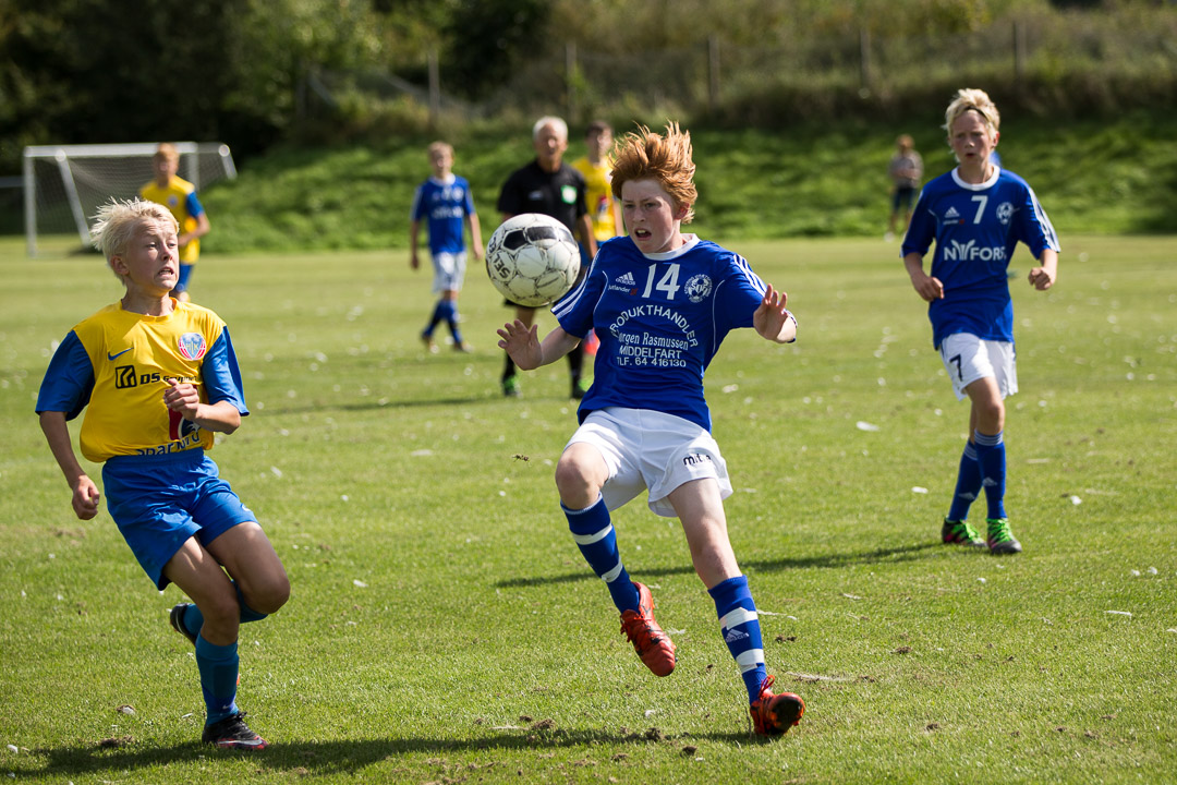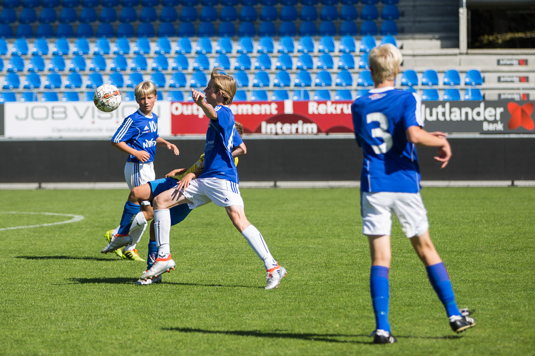 U 15 Vest 2 - her i aktion mod Hobro IK på DS Arena - får besøg af Skjold Sæby fredag 2/9 med kickoff kl. 18.00. Foto: Jes Eriksen/U 15-drenge