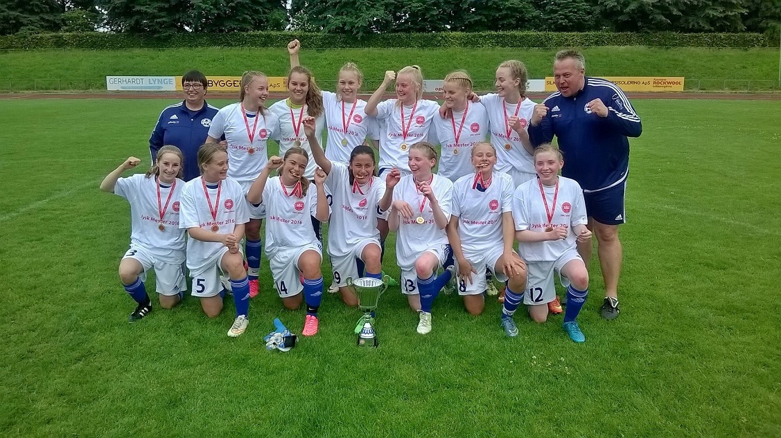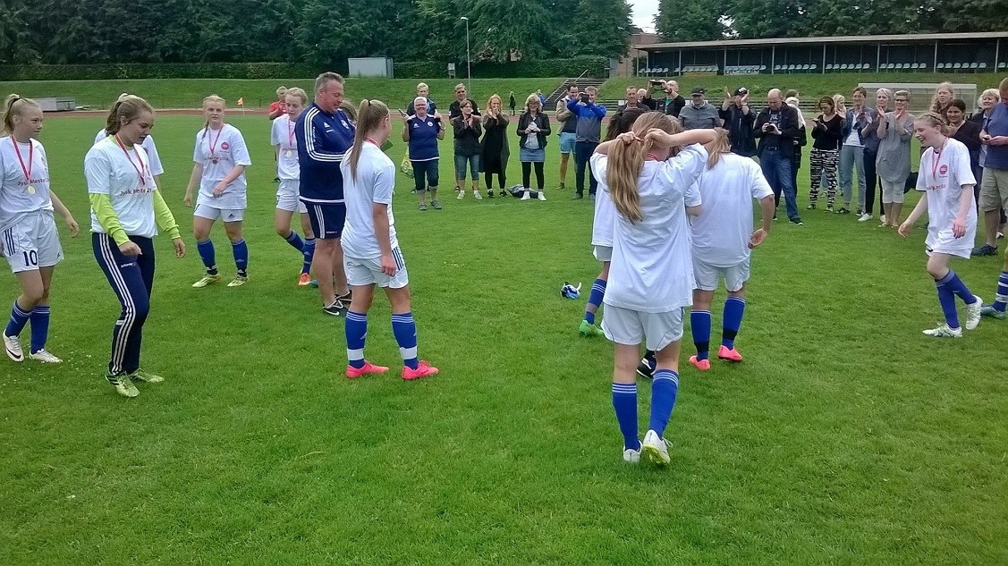 En rørt René Qvist omgivet af jublende spillere, da U 15-piger Mesterrække blev jyske mestre i fjor. Arkivfoto