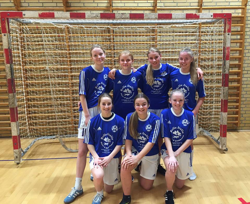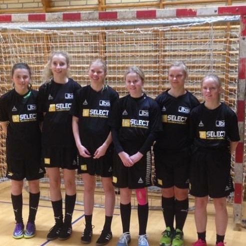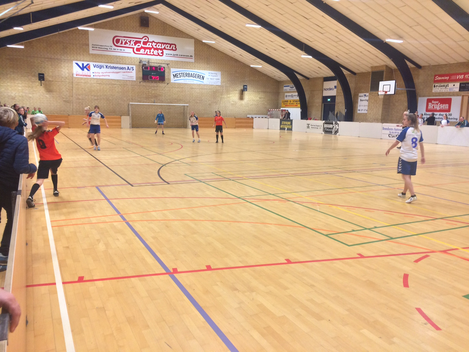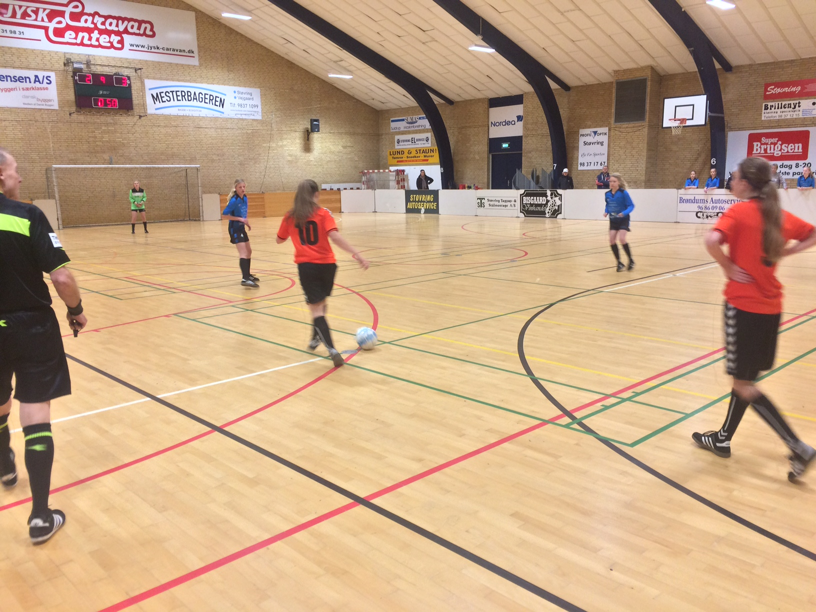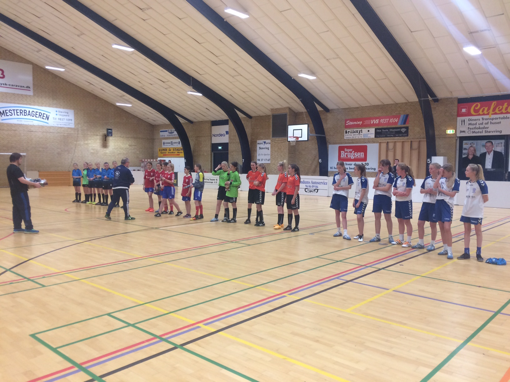 En situation fra en af tirsdagens mange præmieoverrækkelser under Technica Cup. Her gælder det U 14-pigerne, der spillede på store mål i Støvring Hallen.
