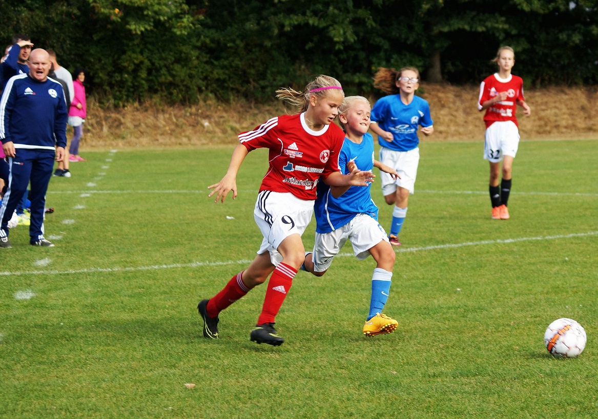 U 13-piger Mesterrække var uden tre af de vante stamspillere men slog alligevel et fysisk stærkere IK Rosendal-hold 1-0 i topkampen i Støvring. Foto: Hanne Andersen