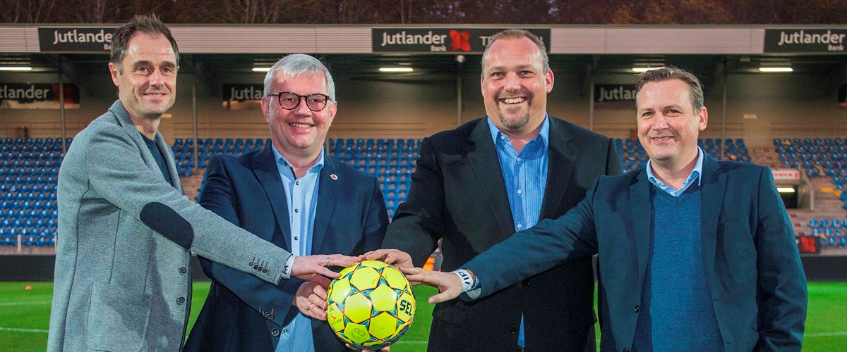 Fra venstre: Anders Damgaard, talentchef i AaB, Per Andersen, formand i foreningen Hobro IK, Allan Kaufmann, formand i Hjørring IF og Claus Fallingborg, formand i AaB af 1885. (Foto: Dannie Rosenkrantz/Hobro IK)