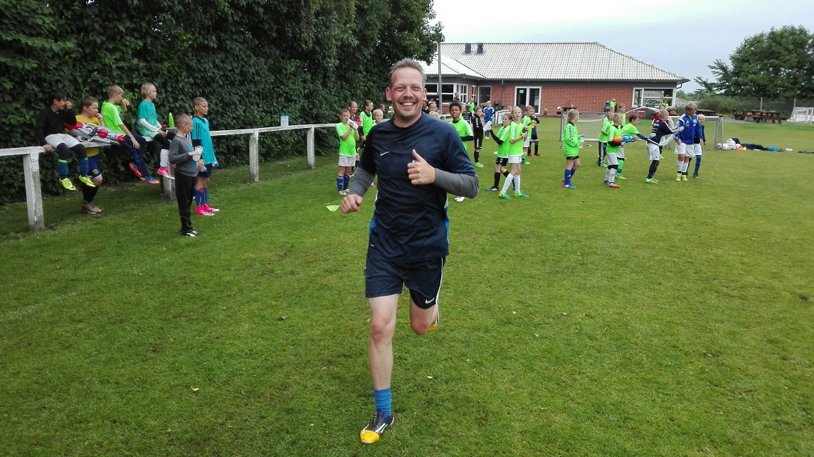 Brian Bloch i en humørfyldt spurt under afslutningen på Maxi Fodboldskolen i fjor. Arkivfoto