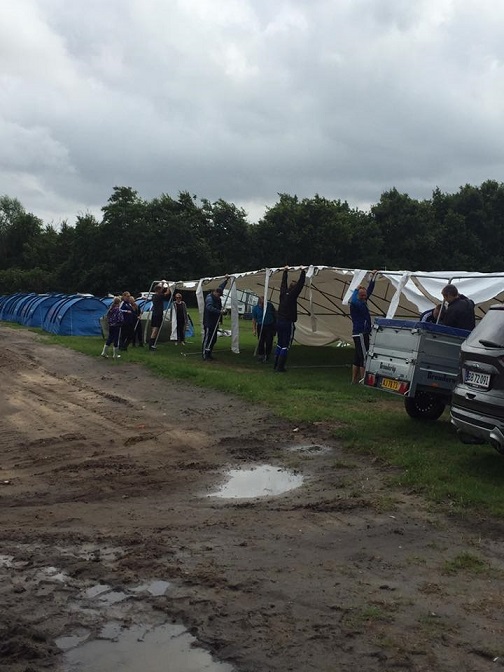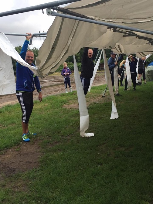 En del af tiden torsdag blev også brugt på at rejse "Fællesteltet" i SIF-lejren, og den opgave blev klaret med højt humør.