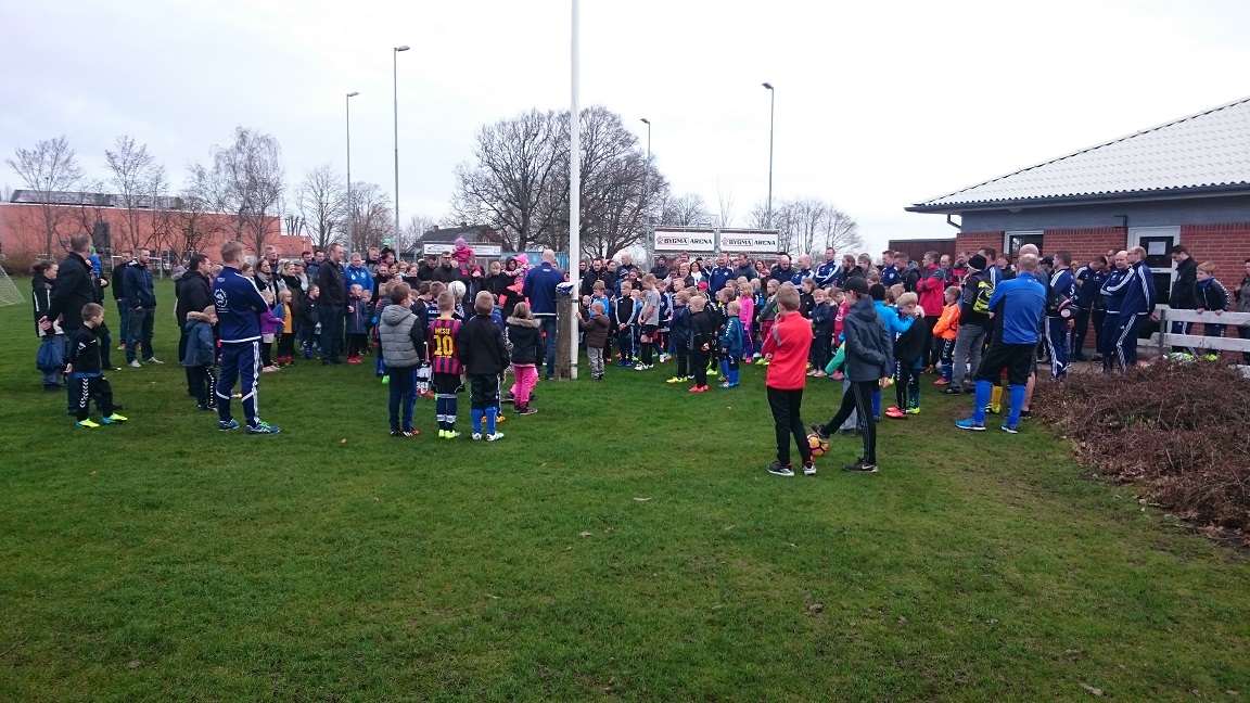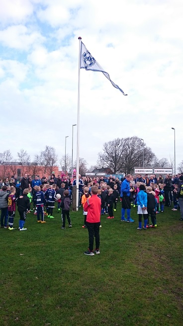 Omkring 150 piger og drenge fra U 6 til U 9 - og rundt regnet lige så mange forældre - tog del i forårets tredje standerhejsning, og det skete søndag 2. april kl. 10.00. Foto: SIF Fodbold