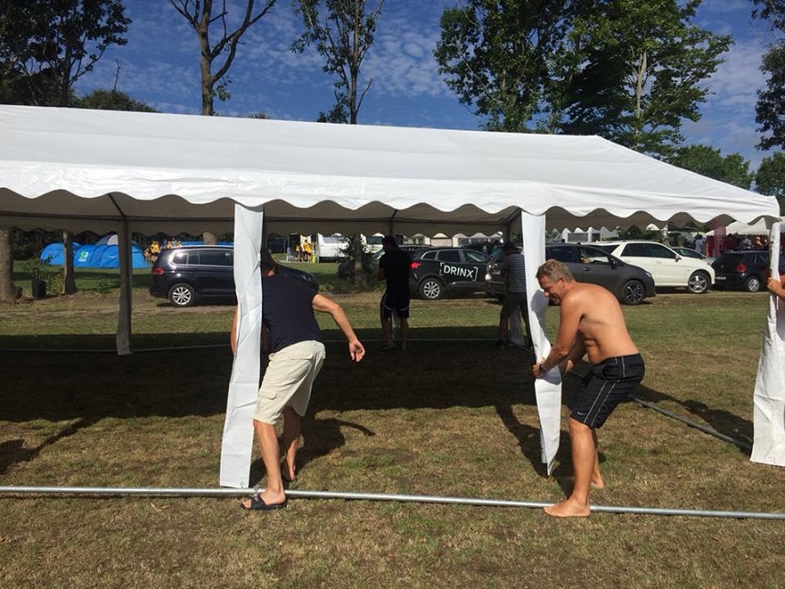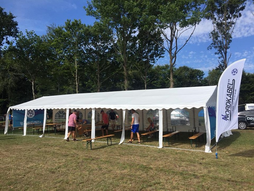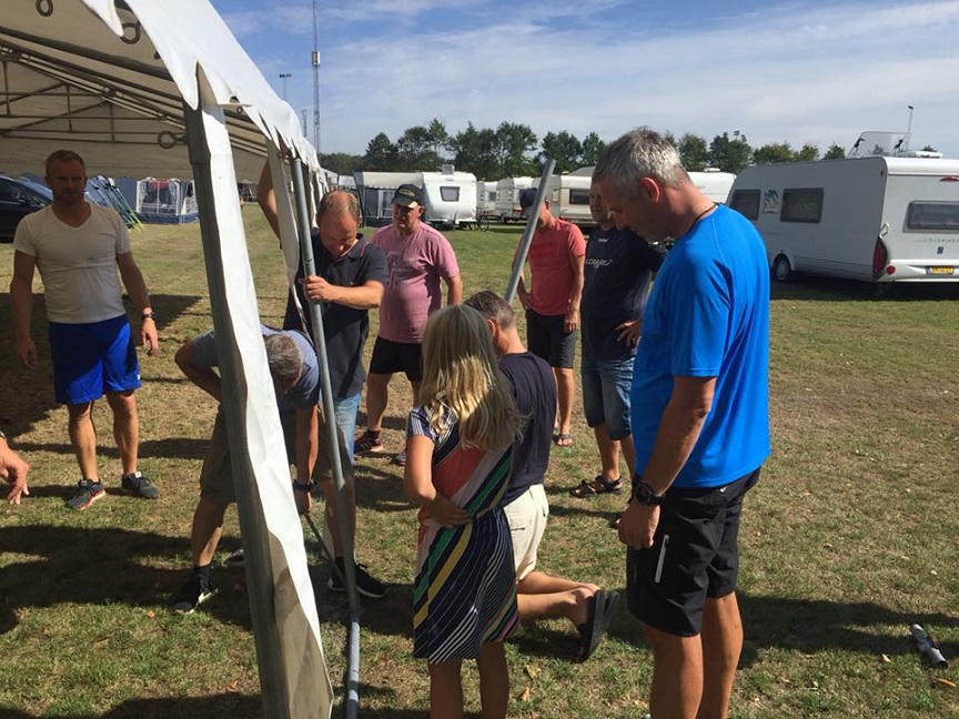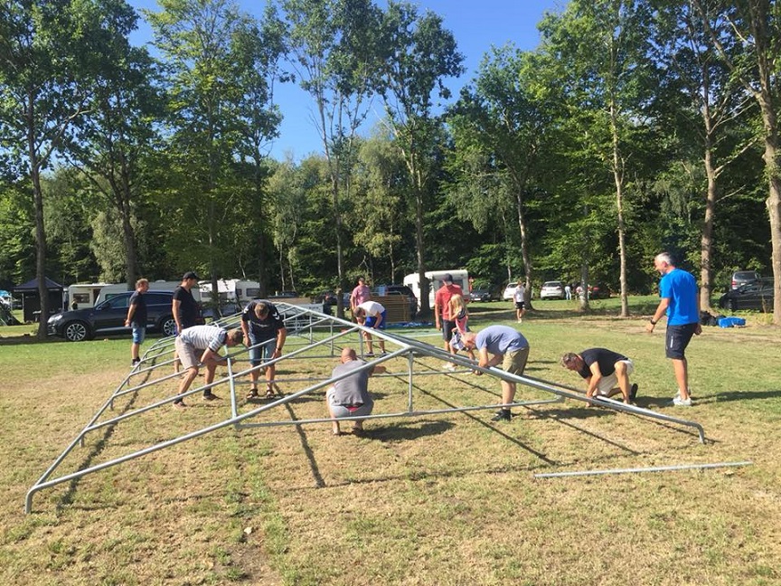 Torsdag var også dagen, hvor en flok forældre/spillere og øvrige familiemedlemmer fik rejst fællesteltet i Camp SIF ved rideskolen, og det var også en aktion, deltagerne slap fra til topkarakter - sådan.