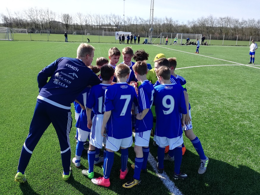 U 13 Liga 2-gutterne og cheftræner Brian Foldager under en peptalk i kampen hjemme mod SMS-Fjends. Fotos: u 13-drenge
