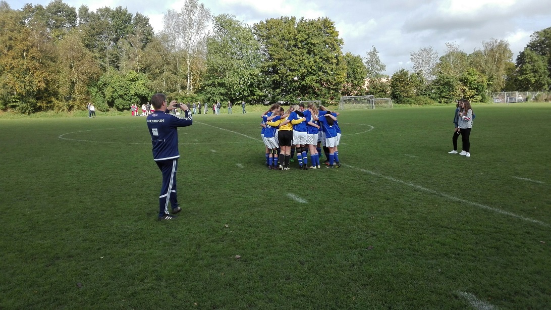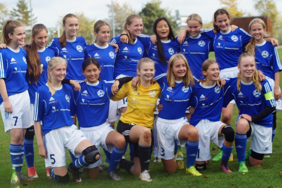 U 15-pigerne i samlet flok efter 2-1-sejren over Hadsund/ASV. SIF-pigerne har vundet U 15 Liga 3-puljen og skal spille i U 15 Liga 2 til foråret. Foto: Hanne Andersen