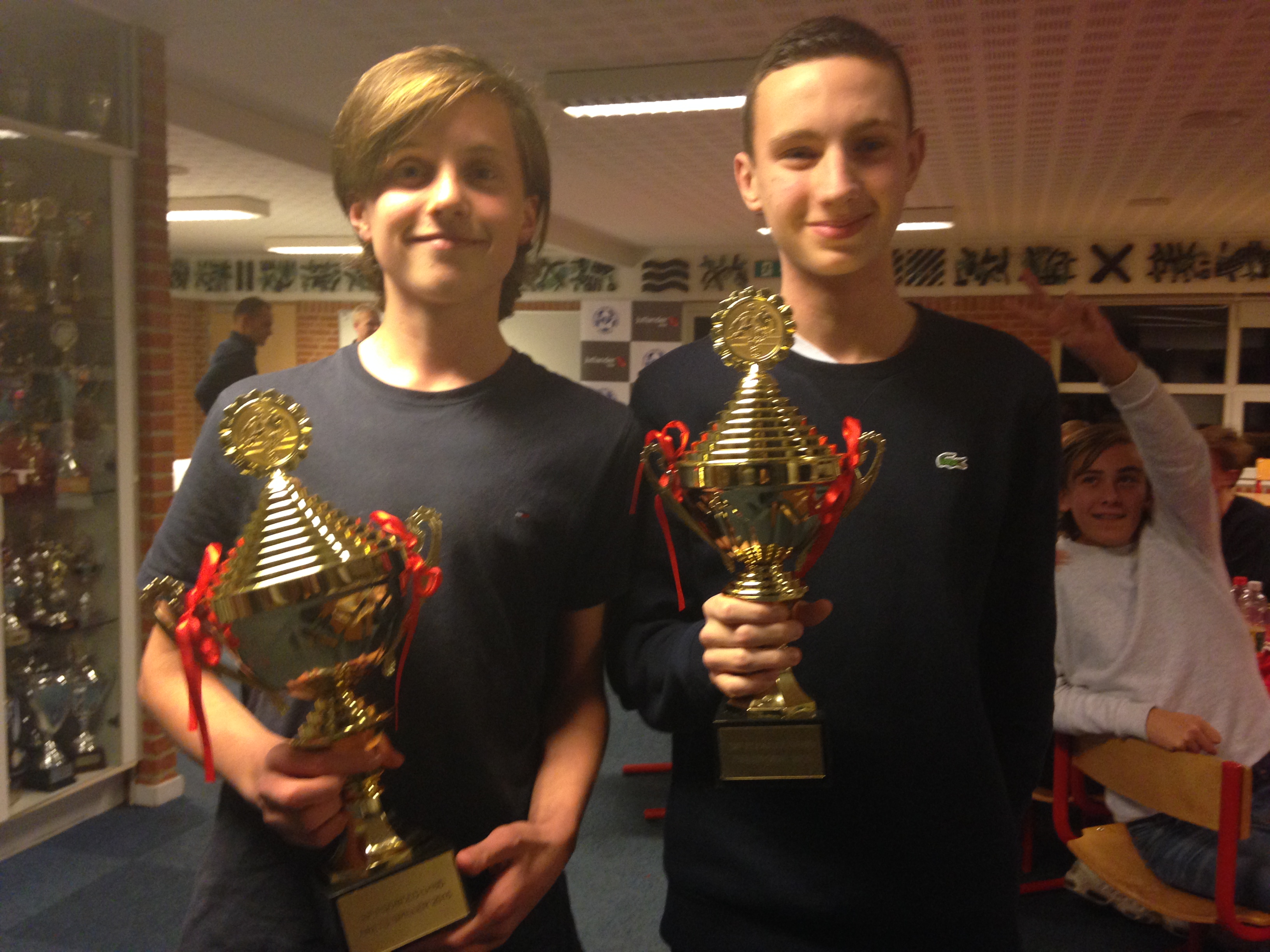 Michael Rugren Andersen (t.v.) og Jonas Sauer (t.h.) modtog pokalerne for henholdsvis årets spiller og årets fiduspokal hos U 16-drengene. Foto: U 16-drenge
