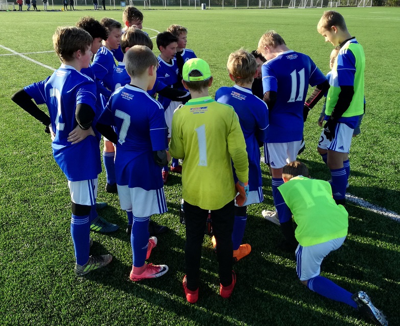 U 14 Liga 2-drenge og Aalborg KFUM før kickoff i søndagens opgør, som SIF-tropperne vandt 2-1. Foto: Lars Hvilsted, U 14-drenge